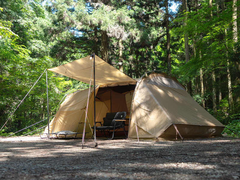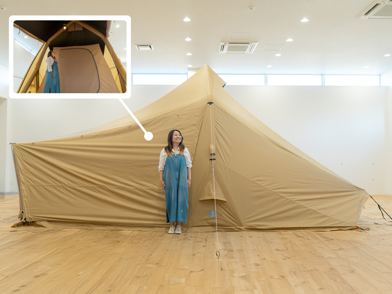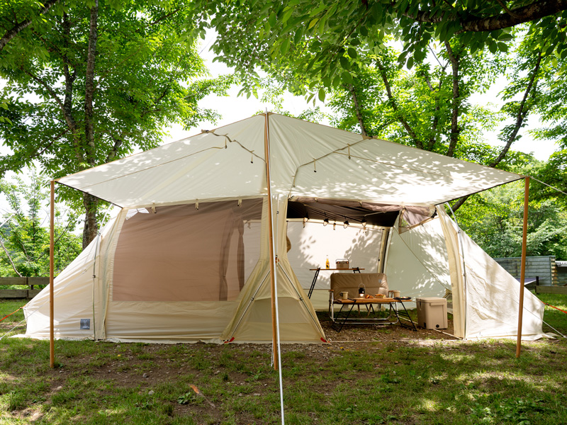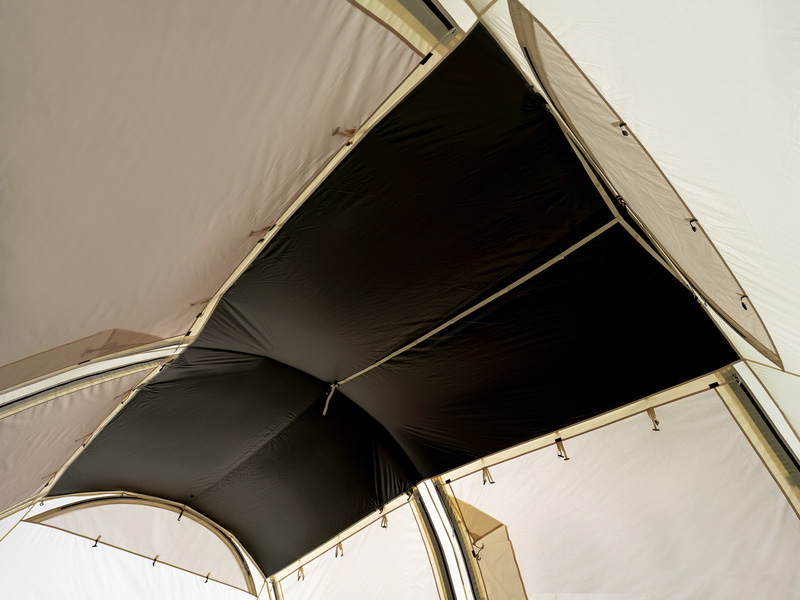テント内の困りごとといえば、日差しによる夏の暑さ。この対策の為に、天井には遮光ブラックコーティングを施しました。一方で、明るさが失われるのも寂しいですよね。そこで側面には光を取り入れる素材を採用し、明るさも確保しています。