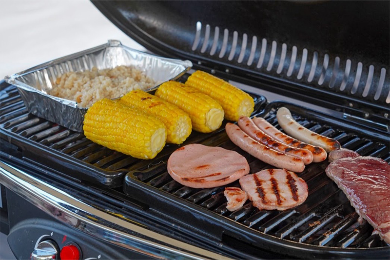 焚き火やコンロで肉や海鮮、野菜を焼くBBQ料理。