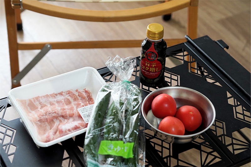 器にトマト、きゅうり、豚バラ肉の順に盛り付けて、旨辛コク増しタレをかけて完成です。