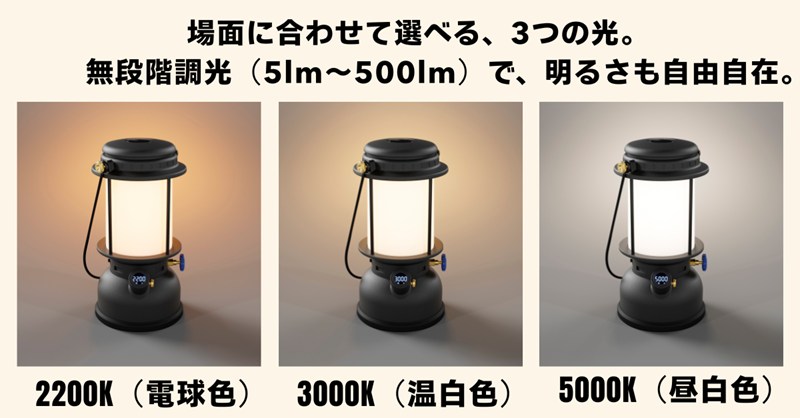 最大500ルーメンの明るさは、無段階に調整可能です。色温度は、暖かく揺らめくような2200K(電球色)、リラックス感のある3000K(温白色)、実用的な5000K(昼白色)の3段階で切替えに対応しています。