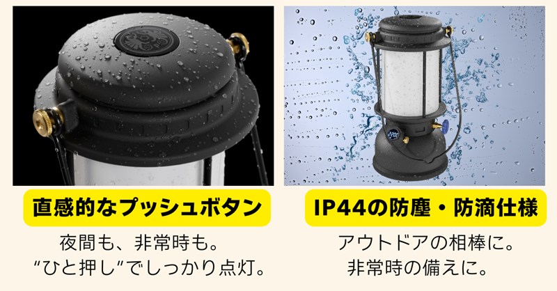 トップのプッシュボタンを1秒押すだけの簡単操作で点灯します。IP44準拠の防滴仕様により、屋外でも安心して使用できます。