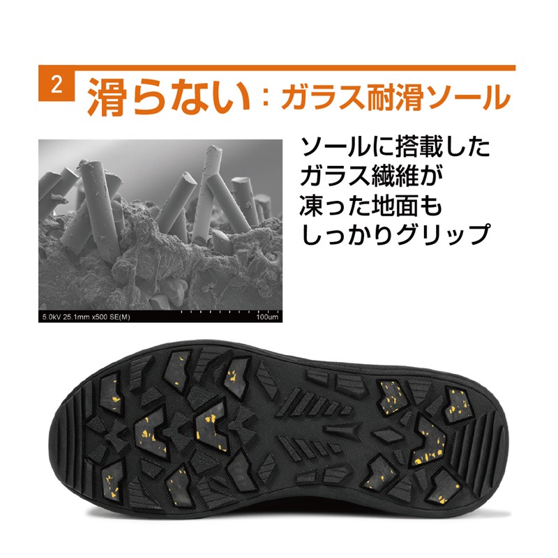 滑りにくいガラス耐滑ソール ソールに無数のガラス繊維を配合することで、凍結した地面や雪道でも高いグリップ力を発揮。雪上や濡れたテントサイトでの安定した歩行をサポートします。(※転倒を完全に防ぐものではありません。)
