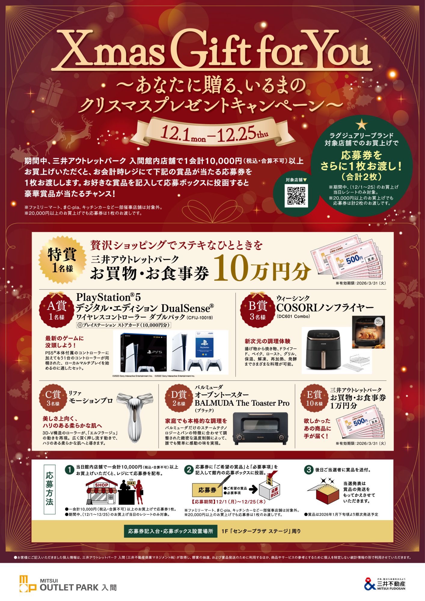 三井アウトレットパーク 入間館内でお買い物いただいたお客様を対象にプレゼントキャンペーンを実施中!詳細は添付・施設WEBサイトをチェック♪