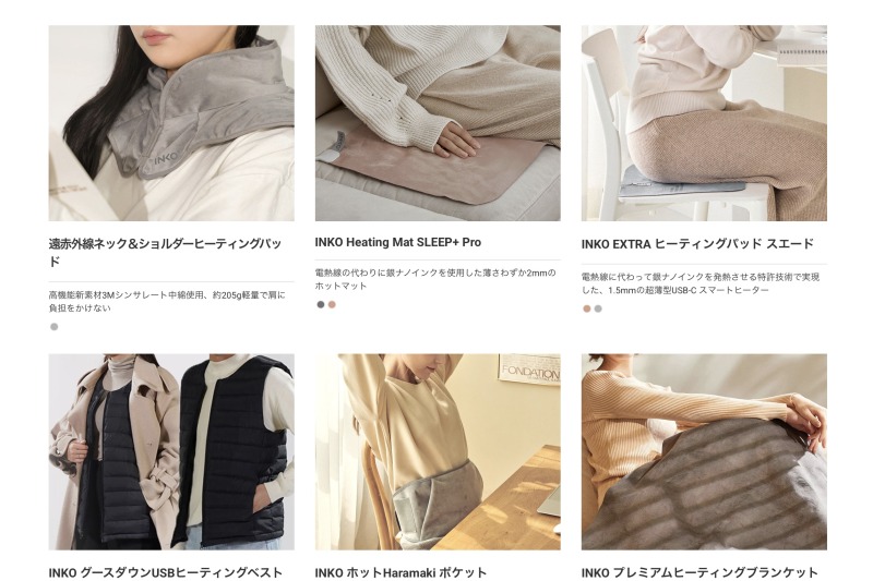 INKOの公式サイトを見ると、小型のハンドウォーマーからブランケットまで、用途に合わせた様々な商品が充実しています。