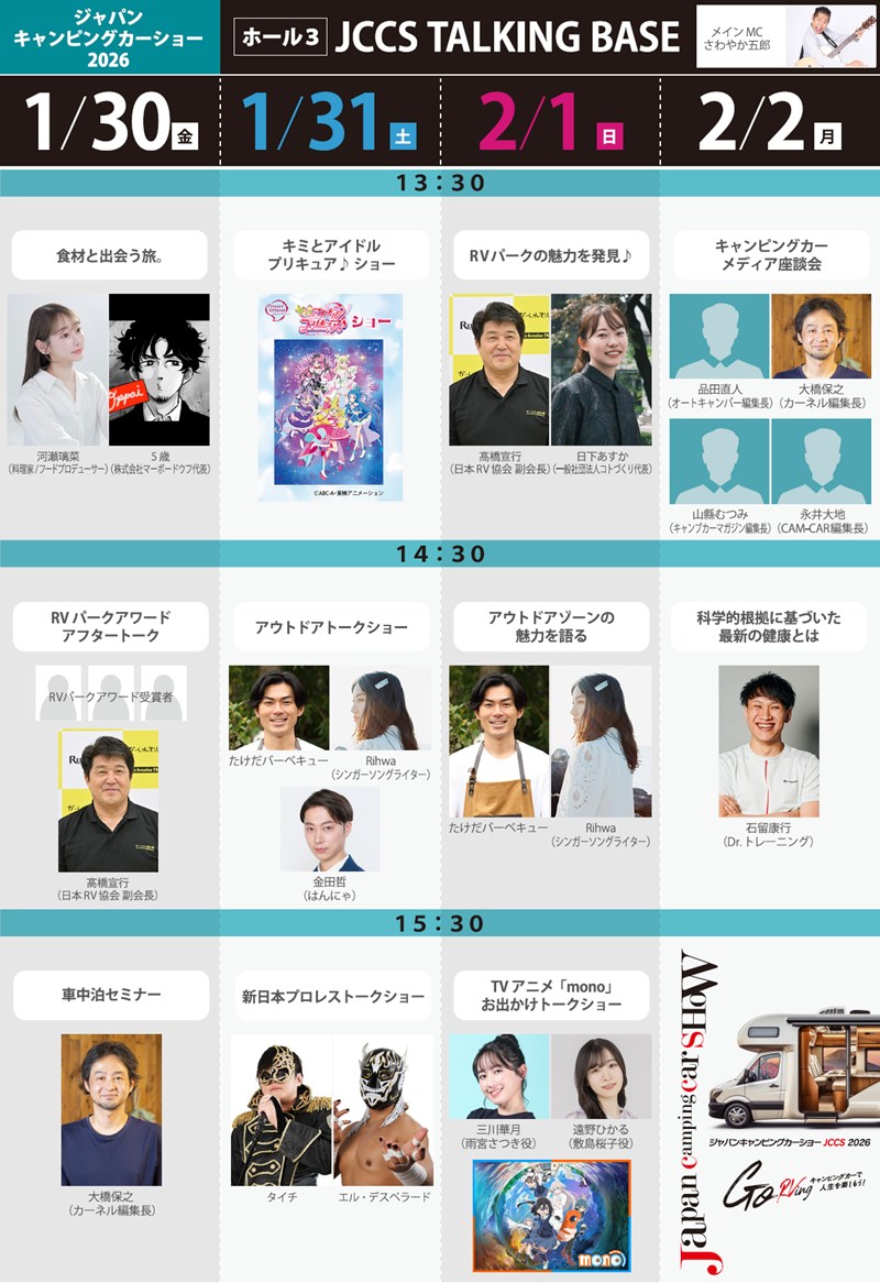 そのほか、キャンピングカーYouTuberや料理研究家など、ジャンルを超えたゲストが、リアルな体験談や役立つヒントを語ります。