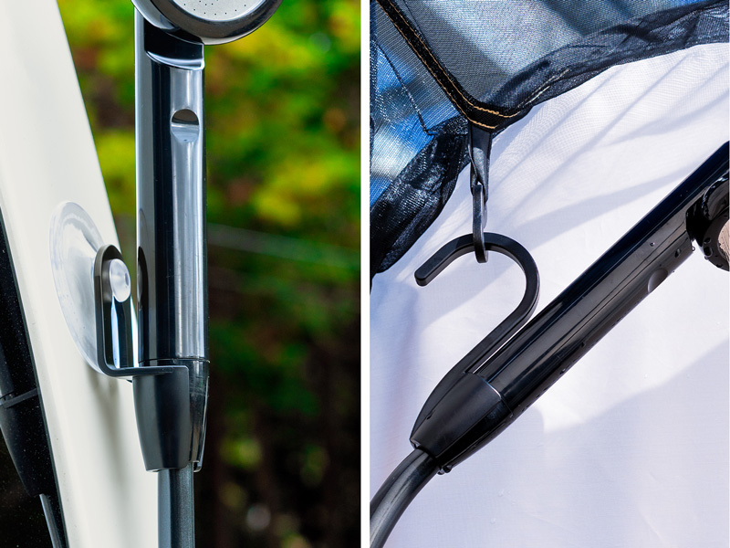 また、車のボディなどに固定できる「吸盤式」と、木やポールに吊るせる「フック式」の2種類のホルダーが標準装備されており、場所を選ばず設置できるのも魅力です。
