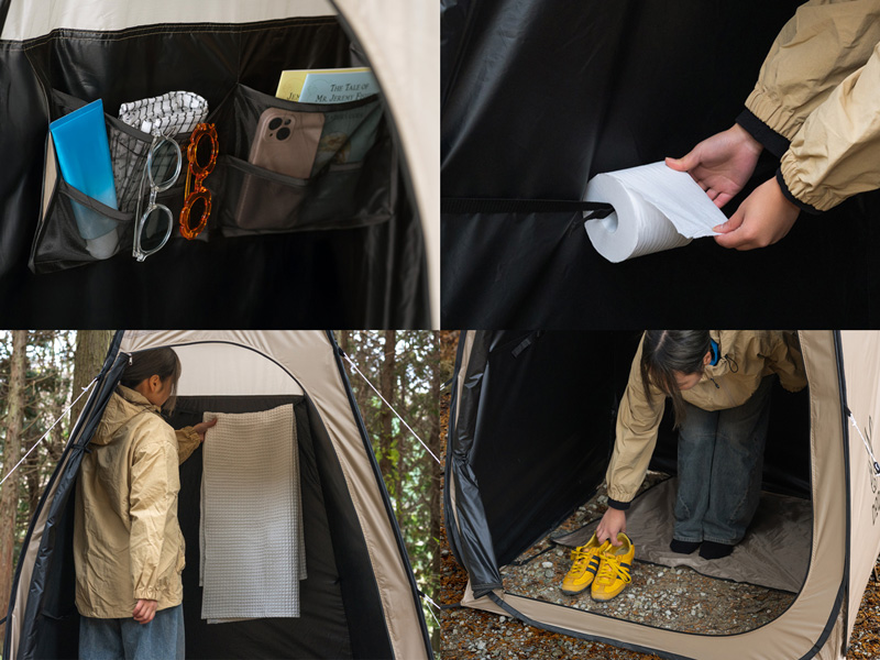 本体には一体式のフロアシート、タオルや服を掛けられるベルト、小物用ポケット、トイレットペーパー設置用ベルトも装備されており、単なる目隠しに留まらない使い勝手の良さが光ります。