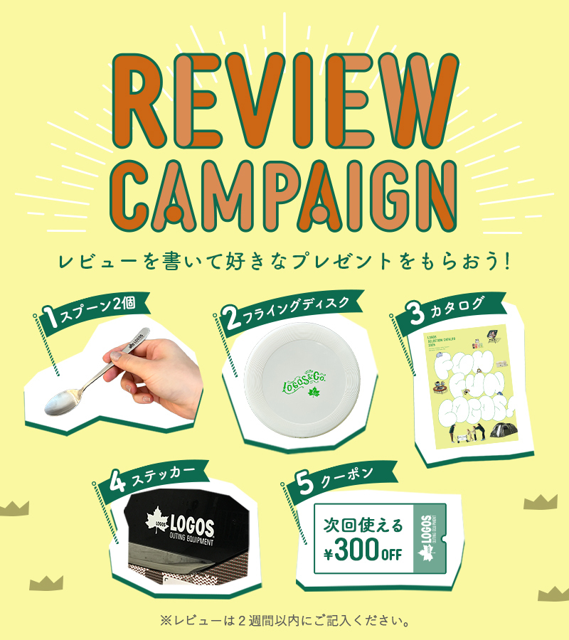 対象店舗にて商品を購入し、レビューを投稿した方の中から先着順で、ロゴスオリジナルアイテムや限定クーポンがプレゼントされます。ここでしか手に入らないアイテムも用意されているとのことですので、お早めのチェックをおすすめします。