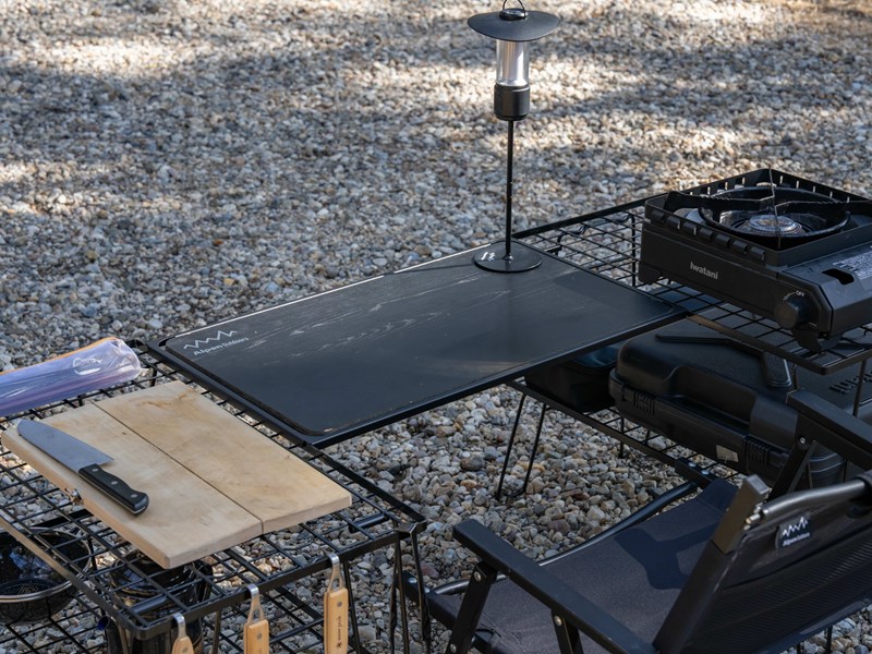 別売りの天板を装着すれば、テーブルとラックの間に新たなスペースが誕生。キッチンスペースを広く取りたい時や、ギアをディスプレイしたい時に大活躍間違いなしのアイテムです。