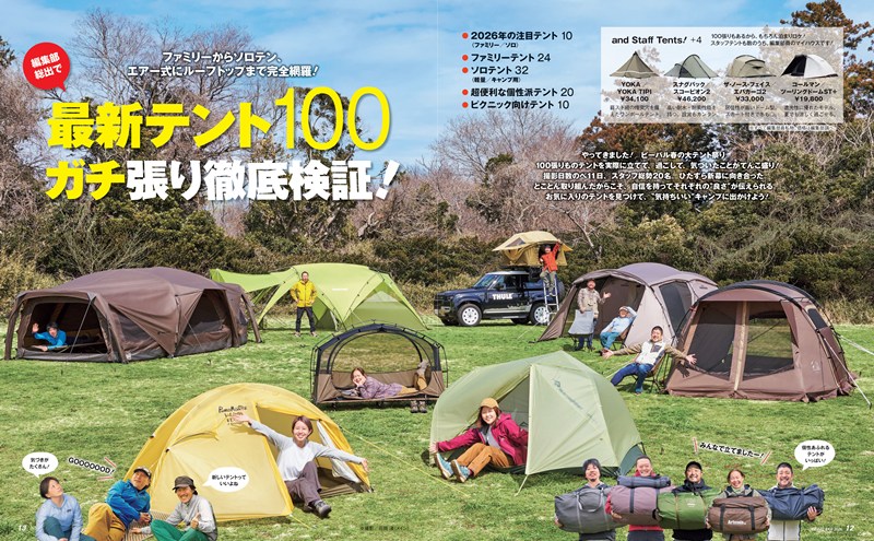 本誌の大特集は、編集部員が総出で挑んだ「最新テント100 ガチ張り徹底検証!」。