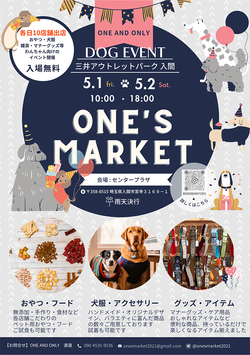 イベント名の由来は、キッチンカー、ハンドメイド、フード、わんちゃんと、計4つの部門が1つのマーケットとなるという意味から、「ONE’s MARKET」と名付けられているそうです。